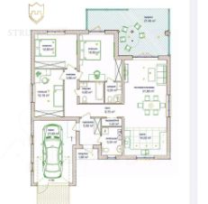 Планировка эргономична и функциональна. Вас встретит просторная прихожая, которая граничит с котельной. Из прихожей дома есть выход в гараж, что очень удобно ведь в гараже хранится много полезных вещей. Блок спален находится далеко от котельной, а значит в спальне будет очень тихо. Три просторные спальни и кухня гостиная, подарят возможность наслаждаться прекрасными пейзажами, открывающимися из окон. Каждый день вы будете просыпаться, любуясь зелеными просторами и слушать пение птиц. Одна из спален имеет выход на террасу, нишу под большой шкаф-купе и личный сан.узел. Вас очень порадует панорамное окно со штульповой дверью (без перемычки), что расширяет пространство гостиной и удобно когда у вас дома праздник и много гостей. Широкие двери ведут на террасу, которая находится под единой крышей дома, там можно отдыхать в любую погоду.