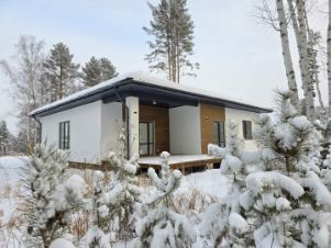 Фасад дома выполнен в сочетании штукатурки и плитки с текстурой дерева. Входное крыльцо дома утоплено внутрь и убережет вас от осадков в ненастную погоду. Надежная крыша вальмового типа имеет установленную систему снегозадержателей и водосточную систему.