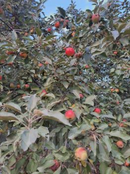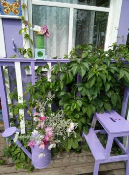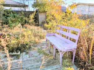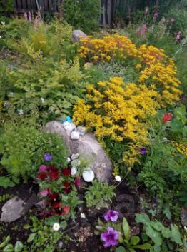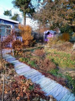 На участке присутствуют разнообразные цветы, кустарники, плодовые деревья. Две прекрасные яблони, вишня, смородина, малина.