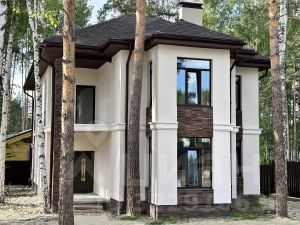 Загородный дом с легкой французской эстетикой. Элегантное оформление фасада - молдинги по периметру дома, узкий декоративный камень, фактурная камешковая штукатурка, изящная ковка на двери. Эркеры в мастер-спальнях создают особую, совершенно очаровательную атмосферу.