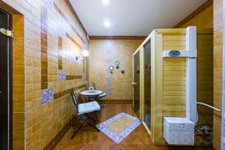На первом этаже - гостиная-столовая, кухня с удобной кладовой, хозпомещения (постирочная и еще одна кладовая), гостевая комната, сауна и гостевой санузел. В гостиной есть зона с камином и местом под библиотеку - для теплых семейных вечеров.