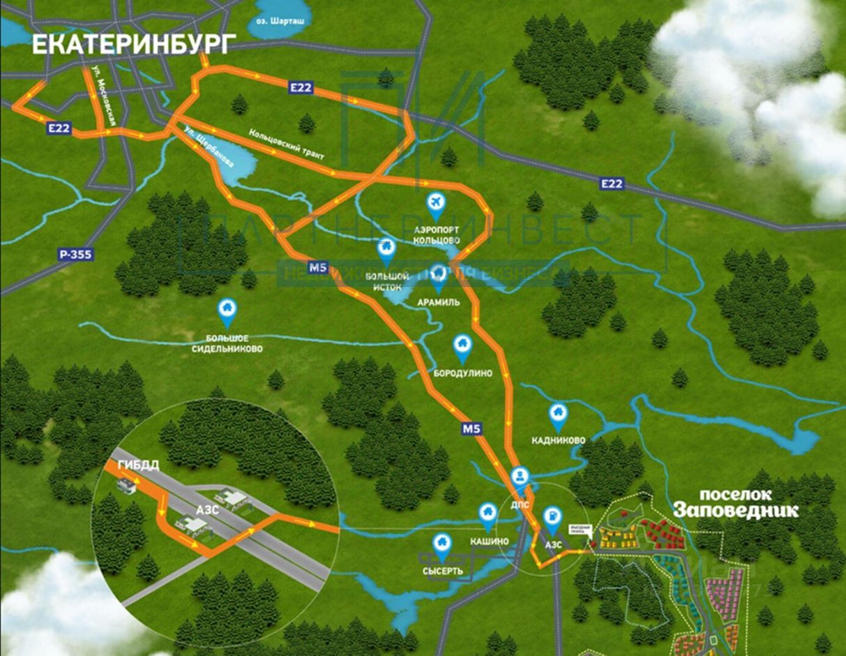 - Расположена группа поселков "Заповедник" по Челябинскому тракту, в 23 км от границы Екатеринбурга. До поселка ведет широкая федеральная трасса М-5, с которой у "Заповедника" есть собственная развязка от трассы до поселка ведет асфальтированная дорога.