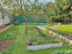 Посадки: Два кедра, один плодоносит, яблони, груша, жимолость, земляника, смородина, маленькое поле и грядки под посадку овощей, растут красноголовики и белые грибы на участке.