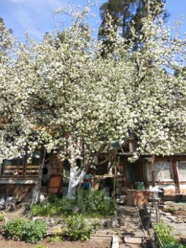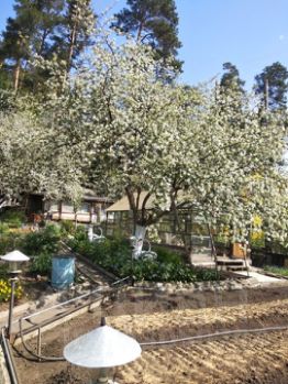 Плодоносящий сад: рябина невеженская (2 дерева), 3 взрослые и 3 молодые яблони, 2 груши, много вишни вдоль участка, смородина, крыжовник, малина, ягодники, а также посадки картофеля и моркови.