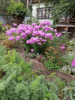 Цветущий сад: жасмин, сирень королевская, гортензия, розы, флоксы, лилии, тюльпаны, курильский чай.