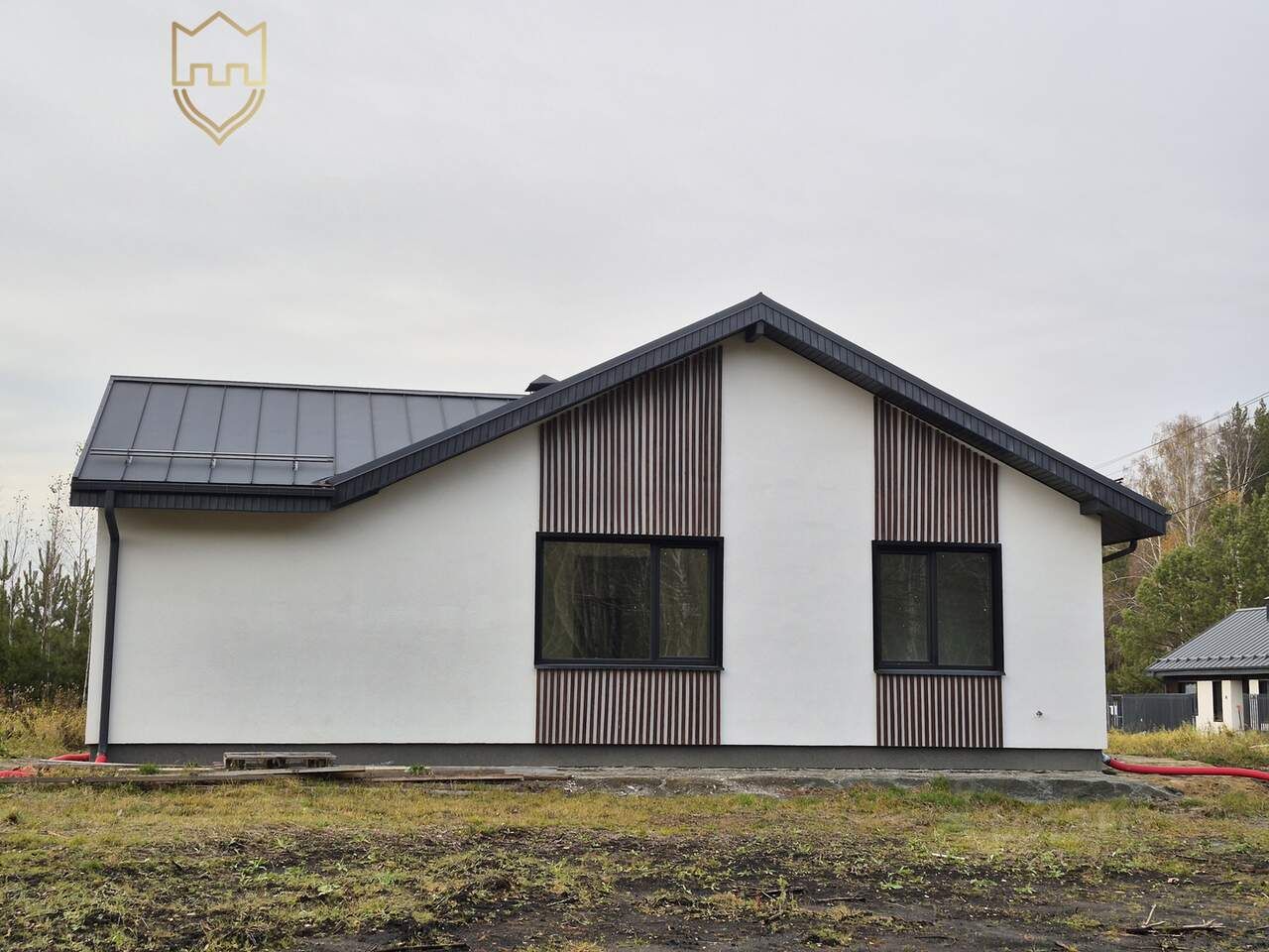 Дом построен из качественных материалов, на высоком монолитном фундаменте. Обустроена наружная водосточная система. Современный и практичный фасад отделан штукатуркой бежевого цвета в сочетании с дизайнерскими элементами, выполненными из древесины орехового цвета. Крыльцо располагается под общей крышей дома и оборудовано ступенями. Оконные проемы оборудованы стеклопакетом с напылением, что позволяет снизить до минимума нагрев в помещении от попадания прямых солнечных лучей в жаркую погоду. Крыша дома покрыта фальцевой кровлей серого цвета и оборудована снегозадержателями — все это вместе придает дому стильный и современный внешний вид.