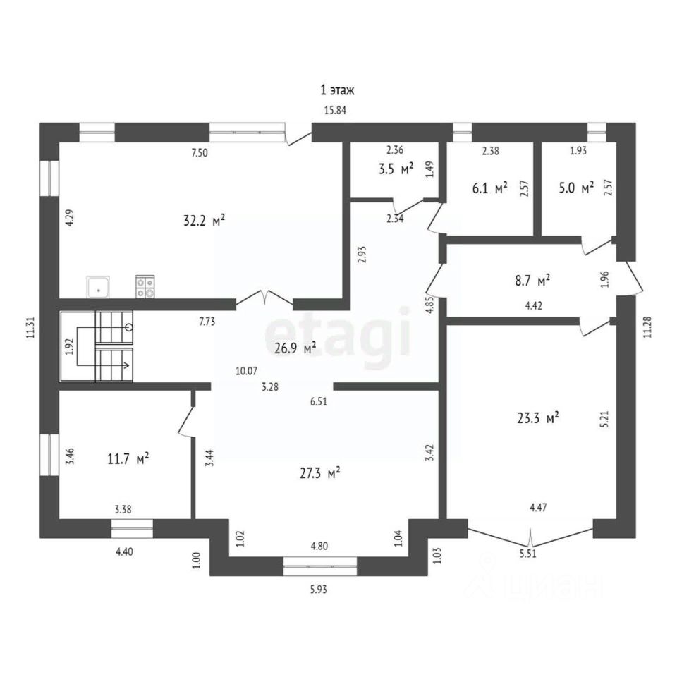 На 1-ом этаже расположены кухня-гостиная- 32,2м2, каминная- 27,3м2 с настоящим каменным камином, комната- 11,7м2, коридор- 26,9м2, санузел раздельный с 2-местной джакузи. Выход в гараж и на открытую благоустроенную террассу.