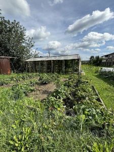 Участок разработан: 2 теплицы, грядки, место для посадки картофеля, плодовые кустарники и деревья.