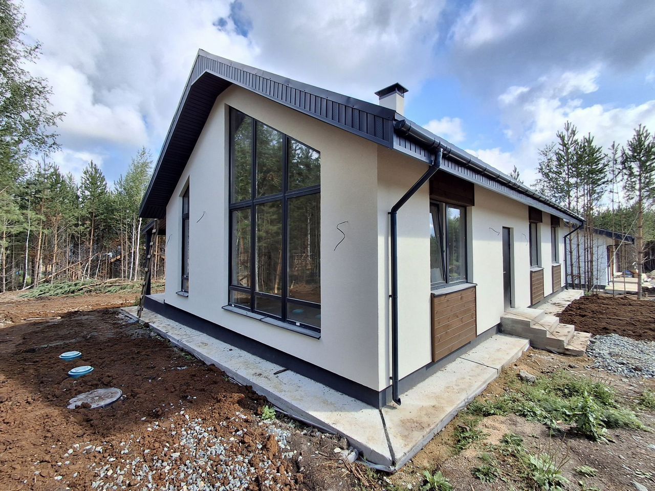 - светлая солнечная кухня-гостиная с потолками высота 5.5м с многочисленными панорамными окнами из которой видна эстетика личного леса!