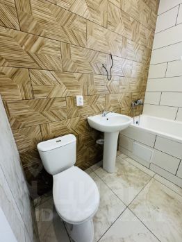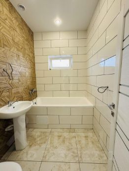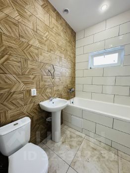 Отделка Под Ключ: на полу - керамогранит, на стенах обои, межкомнатные двери, натяжные потолки с точечными светильниками, в санузле кафель.