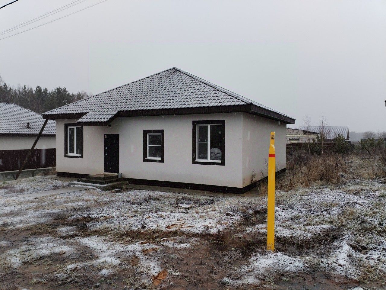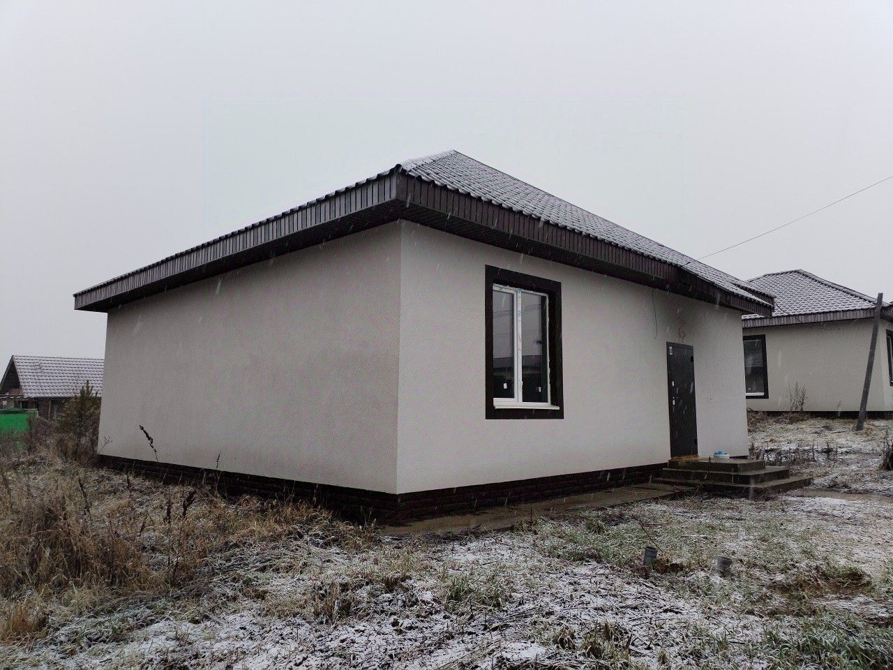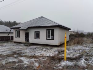 Дом из качественного цементно-песчаного блока + утепленный фасад базальтовой ватой на 100 мм + камешковая штукатурка. В доме большая кухня-гостиная 35 кв.м, две отдельные комнаты по 14 метров, прихожая, котельная и санузел. Высота потолков 3 метра. Отопление в доме от теплых полов, с разбивкой по контурам. Крыша из ондулина , хорошие 5 камерные пластиковые окна 70 мм 3 стекла. Сейф дверь. По дому сделана электроразводка, щиток, розетки и выводы под светильники. Вода от скважины 55 метров, канализация - автономный септик СК Урал.