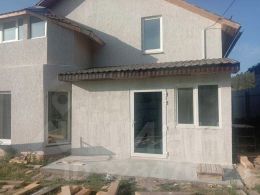 Дом из качественного арболитового блока + утепленный фасад + декоративная штукатурка. В доме большая кухня-гостиная,три отдельные комнаты, прихожая, хозкомната и санузел. Отопление в доме от теплых полов. Двускатная крыша из ондулина , хорошие 5 камерные пластиковые окна 70 мм 3 стекла. Сейф дверь. По дому сделана электроразводка, щиток, розетки и выводы под светильники. Вода от скважины 65 метров, канализация - бетонные кольца. Отделка под ключ.