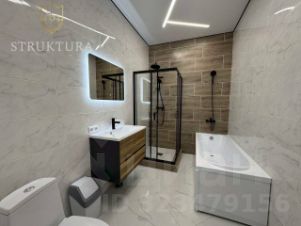 Основной санузел с приятной отделкой, выполненной в современных трендах, не оставит никого равнодушным. Керамогранит под мрамор на полу и стенах, в комбинации с керамогранитом под дерево и стильные световые решения на потолке превратят каждую утреннюю гигиеническую процедуру в настоящий ритуал. Душевая с прозрачным стеклянным ограждением, подвесная тумба с зеркалом с подсветкой и черные смесители добавляют шарма.