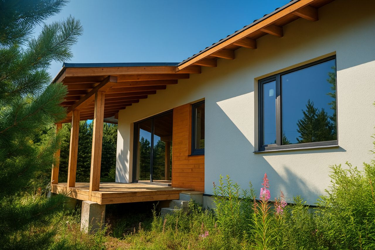 Новый одноэтажный дом, построенный по современным стандартам энергоэффективности.