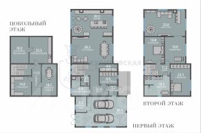 Два полноценных этажа и цоколь. Просторная гостиная, кухня, гардеробные, постирочная, котельная, кладовая и санузел. Гараж на два автомобиля. Три спальни, лаундж-зона и большая ванная на втором этаже. Цокольный этаж открывает безграничные возможности: четыре помещения могут стать винным погребом, лабораторией, пивоварней и кладовой.