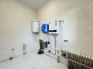 На полу напольное покрытие, на стенах обои, межкомнатные двери, натяжные потолки со светильниками, в санузлах плитка, инсталляция, в котельной котел, водонагреватель.