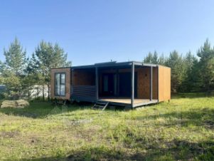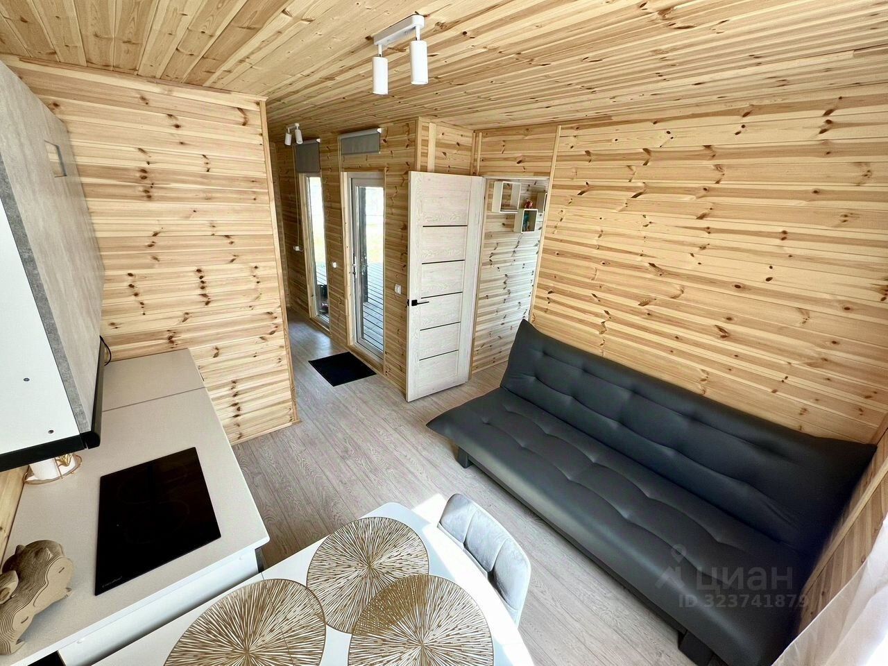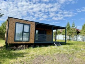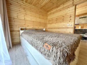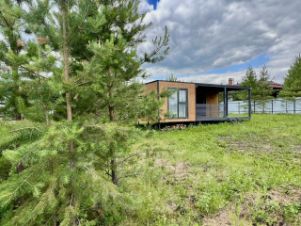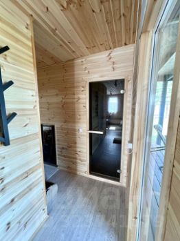 В доме 2 комнаты - спальня с панорамным окном кухня-гостиная, вторая половина дома - парилка, обшитая липой, с дровяной печью Термофор.