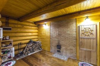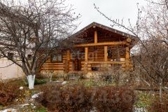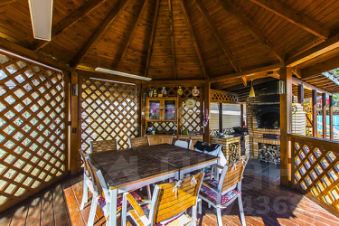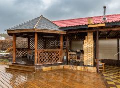 Крытая беседка с зоной барбекю, баня из толстого бревна.