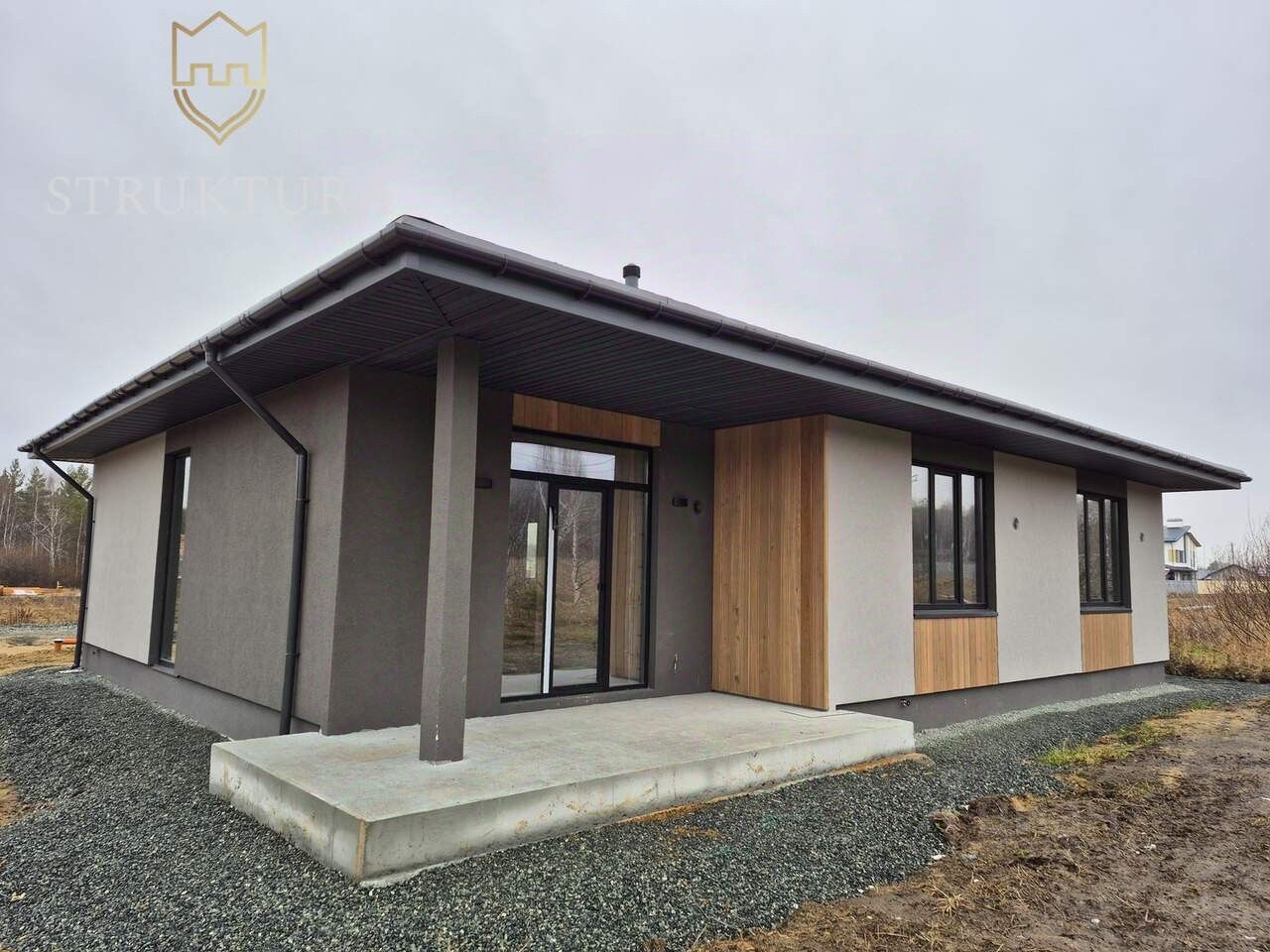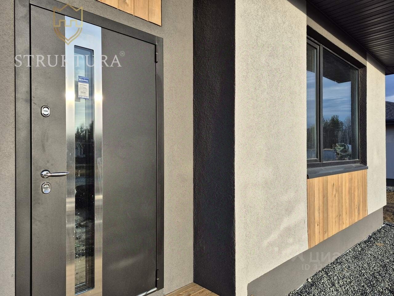 Дом построен из качественных материалов, на утеплённом монолитном бетонном фундаменте. Обустроена наружная водосточная система. Крыльцо располагается под общей крышей дома и оборудовано ступенями. Входная группа декорирована планкеном. Современный и практичный фасад отделан фактурной штукатуркой "Короед" серого цвета со вставками из древесного планкена в сочетании с оконными рамами чёрного цвета. Крыша дома покрыта кровлей из металлочерепицы и оборудована снегозадержателями — всё это вместе придает дому стильный и современный внешний вид. Оборудована система приточной-вытяжной вентиляции. Установлены энергосберегающие стеклопакеты с нанонапылением оксидов серебра в летнее время они отражают избыточный ультрафиолет, что позволяет помещениям не нагреваться изнутри и сохранять комфортную температуру, а в холодный период препятствуют выходу тепла от отопительных приборов. Установлены морозостойкие входные двери.