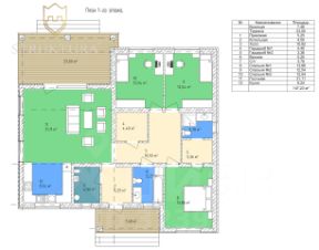 Большое крыльцо идеально подойдет для размещения уютного кресла и кашпо с цветами. Войдя в дом, вы попадаете в просторную и светлую прихожую, где помещаются шкаф для верхней одежды, зеркало и консоль. Сразу при входе расположена котельная-постирочная, там можно разместить умывальник, лапомойку, стиральную и сушильную машину. В центре дома есть отдельная гардеробная, для размещения всех вещей вашей большой семьи. А напротив расположился основной сан.узел с окном, где выделено место под ванную.