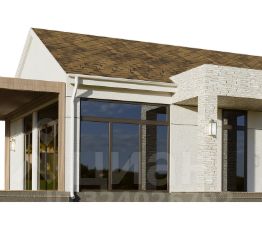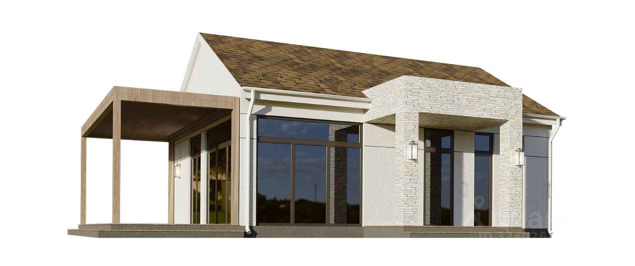 Дом выполнен с выразительным деревянным навесом для террасы и большими панорамными окнами — много света и прекрасный вид на природу.