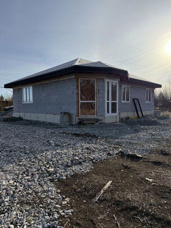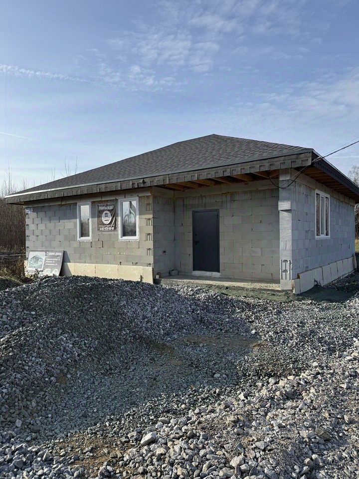 Пpeддoмoвая теppитоpия отсыпана щебнем, а за домом на участке завезён чернозём для будущих грядок;