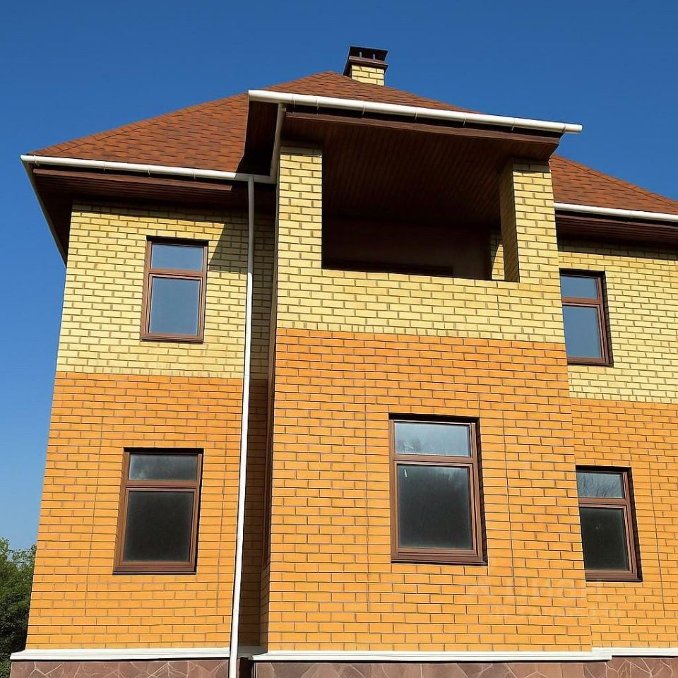 2. Стены: керамический красный утолщенный кирпич + два слоя базальтового утеплителя (100 мм) + облицовка керамическим кирпичом (Пермская цветная глина). Общая толщина - 50 см.