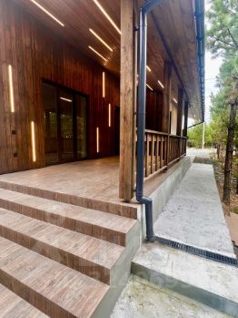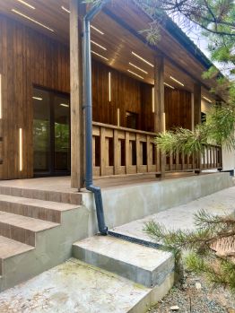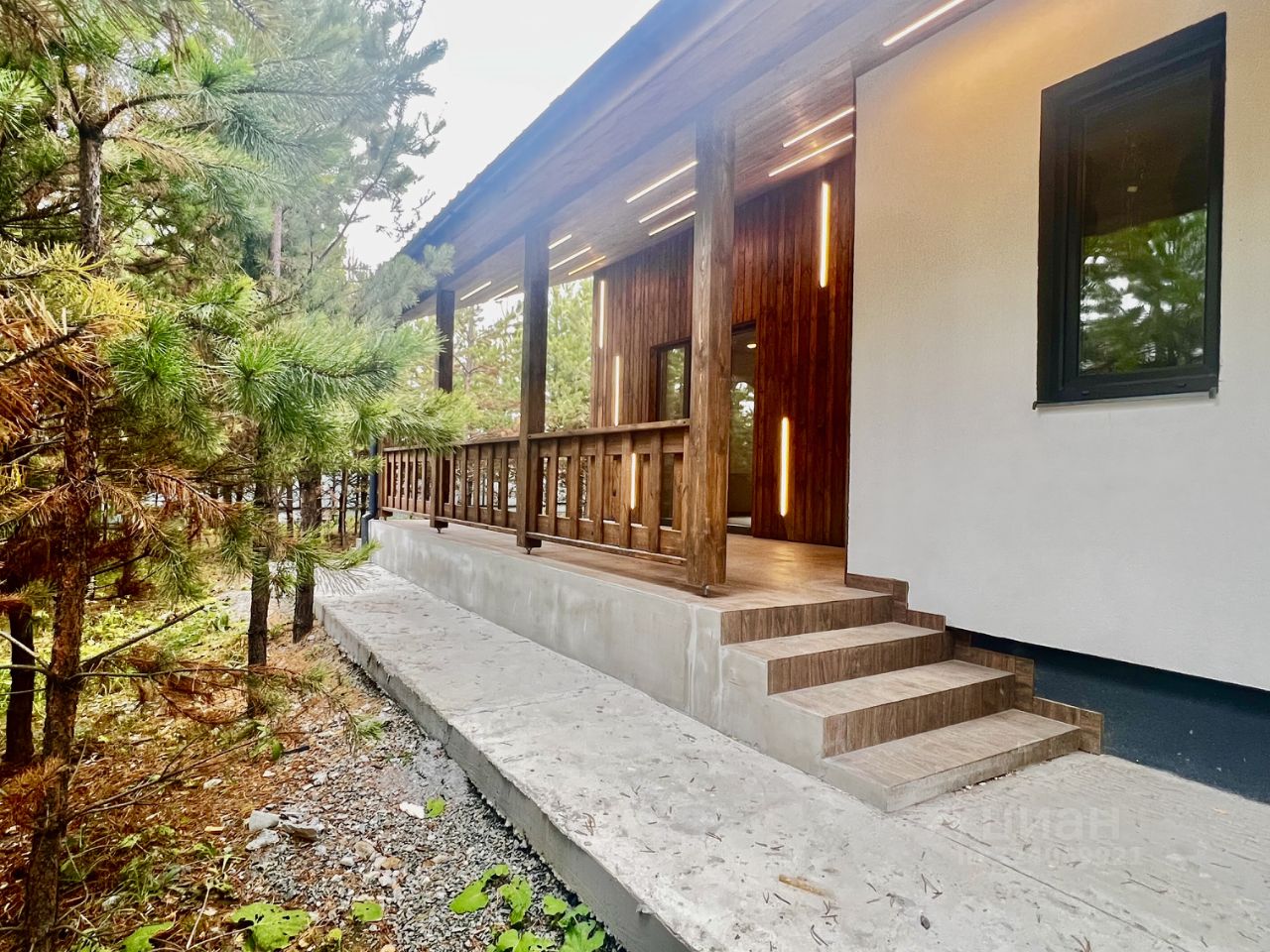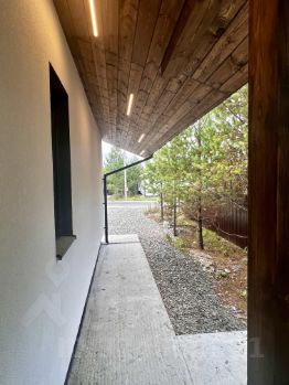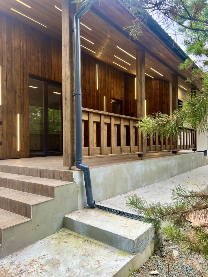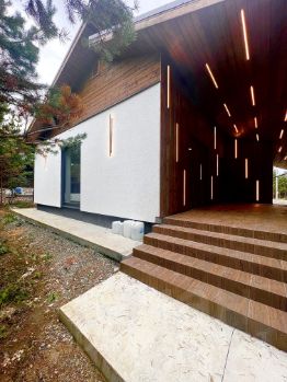 Фасад: декоративная мелкозернистая штукатурка( шуба), с элементами планкена из дерева с линейной подсветкой. Блоки управления подсветкой выведены а котельную для удобного обслуживания !!!