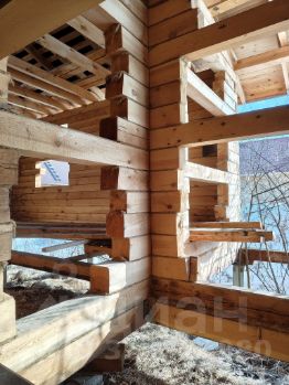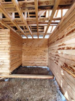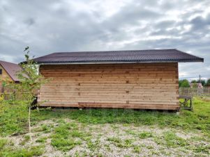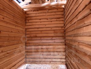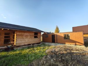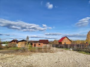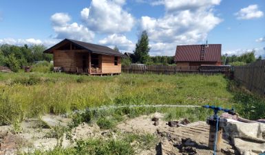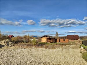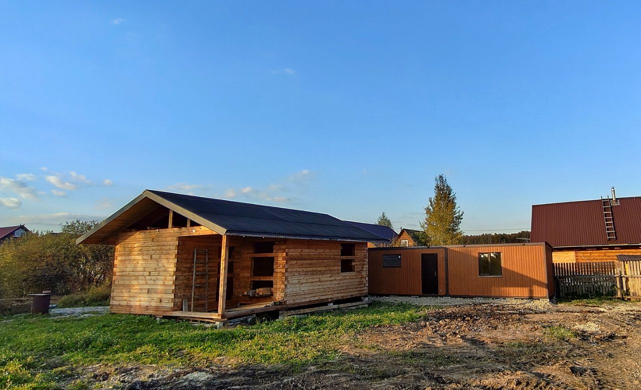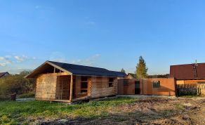 На участке, ближе к пруду, установлен большой сруб гостевого дома - бани 9 х 6 м на 4 отделения с террасой, заведён под крышу (брус 150 х 150, нижние венцы лиственница, жёстко закреплены на бетонных сваях). Сруб выстоялся, прошёл усадку и готов к обшивке и благоустройству.