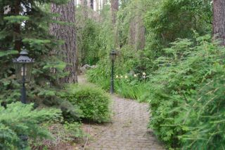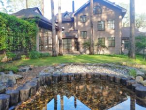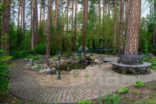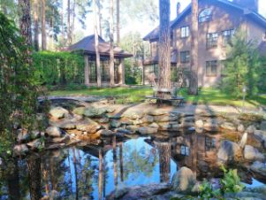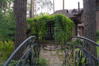 Земельный участок правильной формы, площадью более 15 соток, на участке растут вековые сосны, ели. Произведен хорошо продуманный ландшафтный дизайн территории: два пруда, кованные мостики, альпийская горка с водопадом, дорожки из натурального камня. По периметру кованный забор. На территории участка установлены две беседки с кованными элементами декора в диком винограде, капитальная беседка, оборудована мангальная зона.