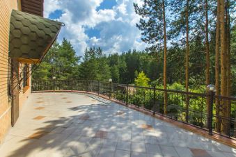 Огромная терраса третьего этажа площадью 65 кв.м. выходит на участок с видом на лес.