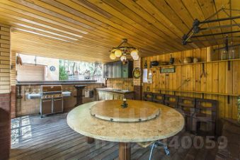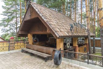 просторная беседка для большой компании с зоной барбекю и китайским столом;