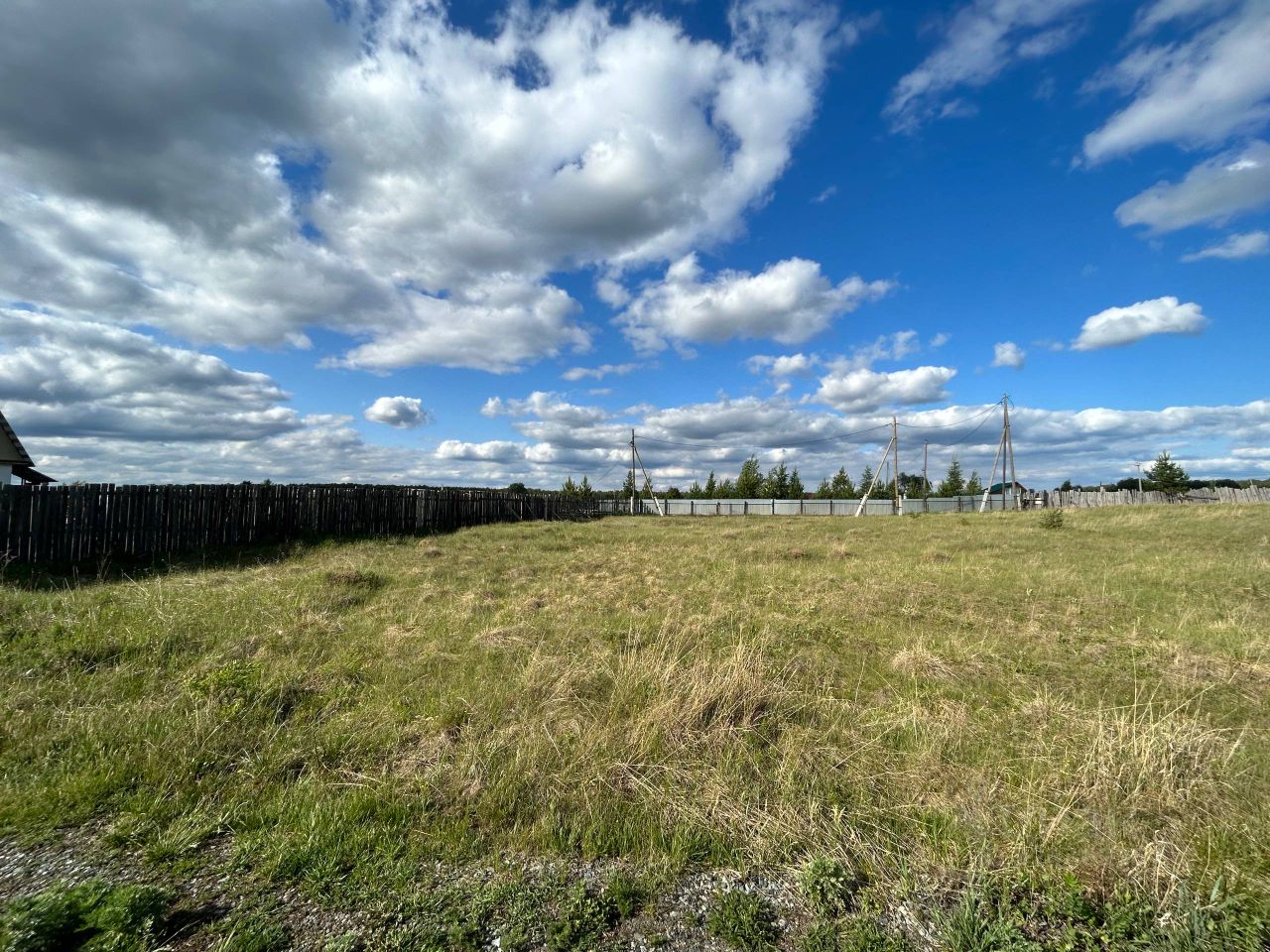 Постройки на участке отсутствуют — стоит металлический забор с тыльной стороны и деревянный по левой стороне.