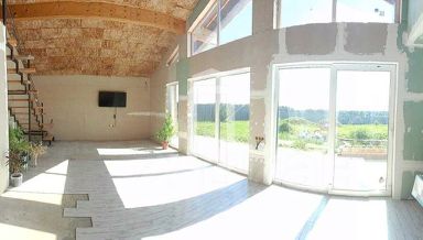 Кухня-гостинная со вторым светом высота 5,5 м с выходом на терассу, с панорамными окнами во всю стену видом на закат.
