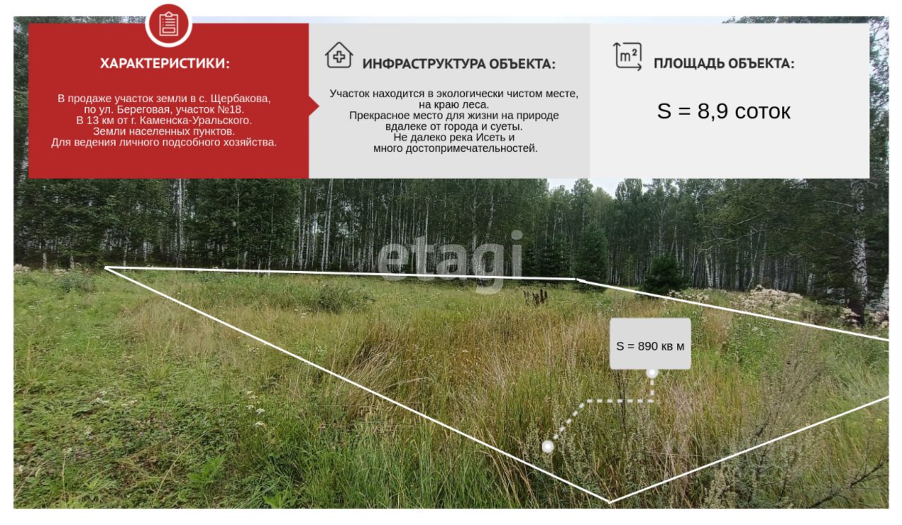В продаже участок земли в с. Щербакова, по ул. Береговая, участок 18. В 13 км от г. Каменска-Уральского. Земли населенных пунктов. Для ведения личного подсобного хозяйства. 8,9 соток.