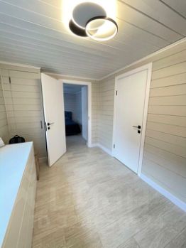 очень уютный. В доме расположены - прихожая, спальня, кухня-столовая с панорамными