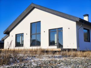 Дом построен с учётом всех особенностей местности — высокое расположение обеспечивает прекрасный вид и защиту от влаги. Фасад дома выполнен в элегантном стиле: белая декоративная штукатурка гармонично сочетается с изящными деревянными элементами. Двускатная крыша покрыта металлочерепицей, гарантирующая надёжную защиту от любых погодных условий.