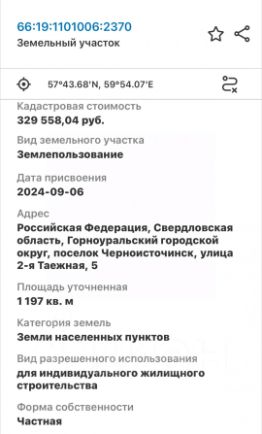 Арт. 127563111 Продается земельный участок в п. Черноисточинске на ул. 2-я Таежная 5. Участок правильной формы 12 соток. Вид разрешенного использования -ИЖС. Отличное место. Повсюду многолетний лес. Новая коттеджная застройка. Место тихое, спокойное. Звоните.