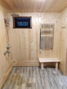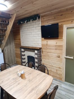 На первом этаже банный комплекс и комната отдыха с теплыми полами.
