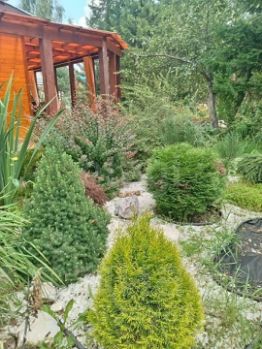 Участок отличается продуманным озеленением: здесь высажены голубые ели, пихты, сосны, плодовые деревья и ягодные кустарники, включая яблоню, вишню, сливу и несколько сортов малины и крыжовника.