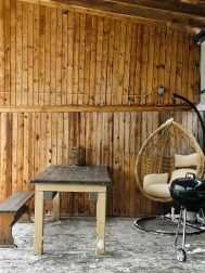Отдельного внимания заслуживает уникальный, неповторимый забор из кольев, который подчёркивает природный стиль дома и создаёт особую атмосферу уюта и приватности.