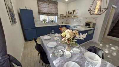 Первый этаж: просторная гостиная с кухней-столовой, санузел, котельная, второй этаж: три спальни с шикарными видами, санузел с ванной.