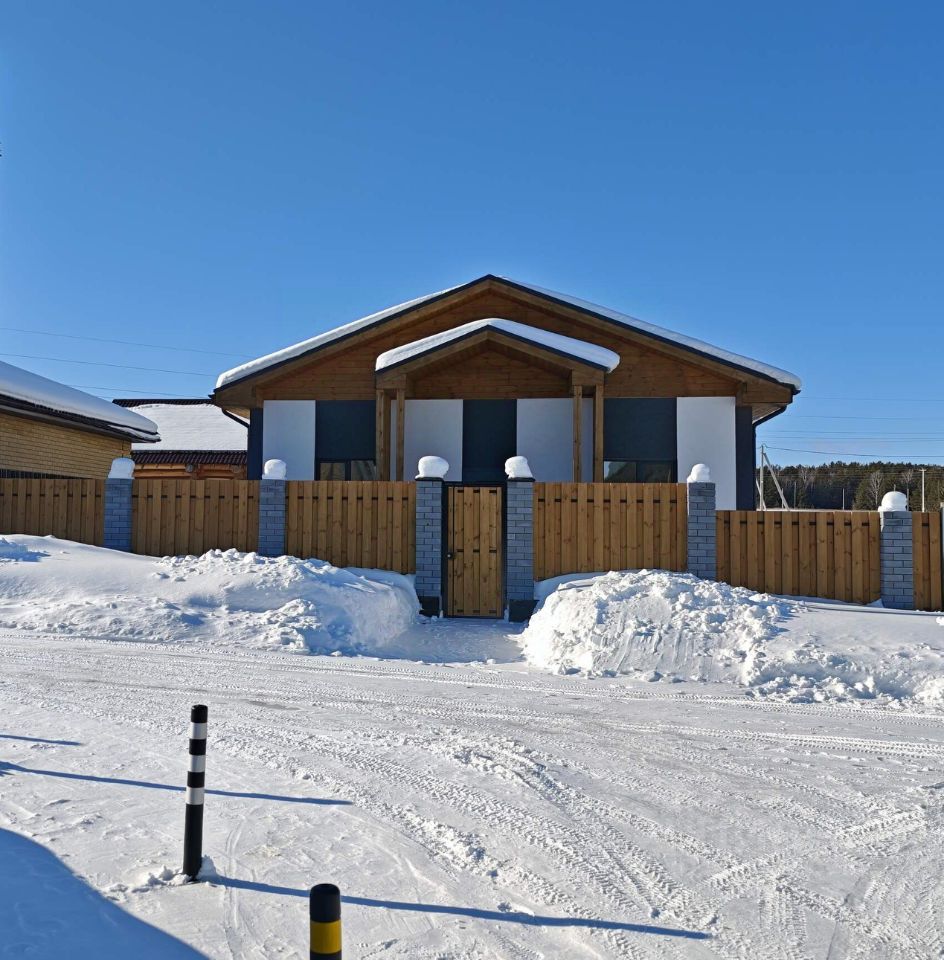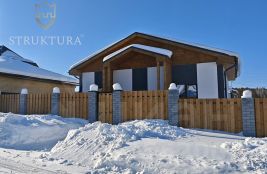 Фасад дома выполнен в элегантном стиле: белая декоративная штукатурка гармонично сочетается с изящными деревянными элементами. Крыша покрыта современной мягкой черепицей, гарантирующей надёжную защиту от любых погодных условий.