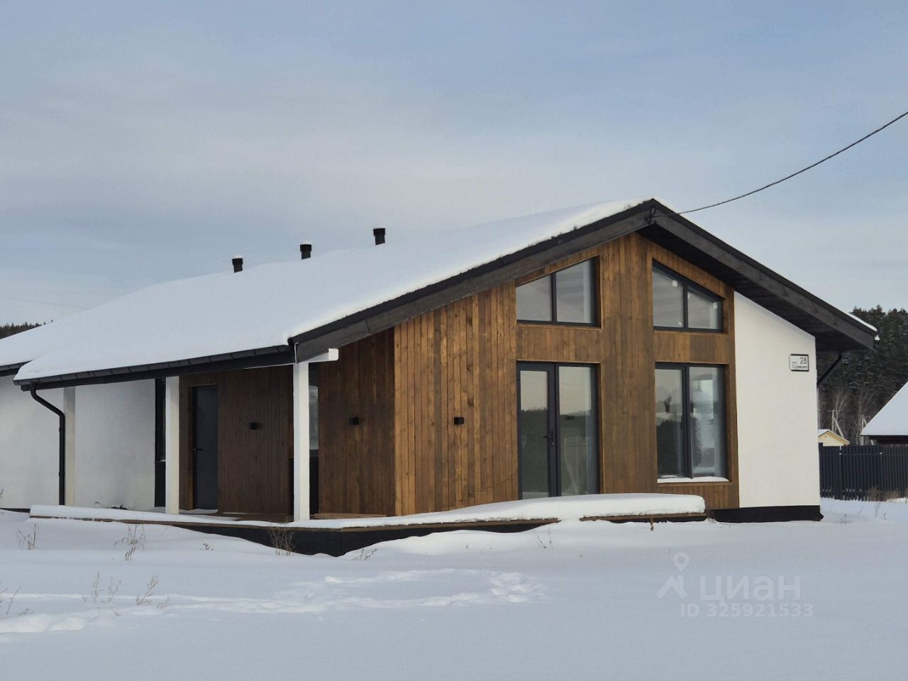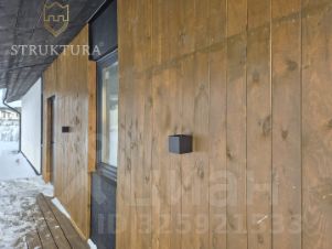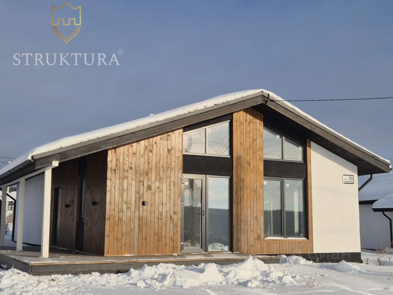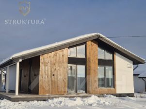Уже при первом взгляде на дом привлекает его интересная архитектура. Входная группа обшита деревянным планкеном. Покрытие кровли выполнено металлочерепицей серого цвета в тон с окнами, на кровле установлена система снегозадержателей и водосточная система. Терраса — идеальное место для отдыха на свежем воздухе в любую погоду. Фасад дома выполнен в сочетании штукатурки и натурального дерева.