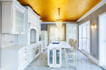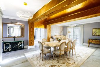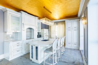 Использовались дорогие европейские материалы, мебель под заказ, предметы декора и антиквариат привозился специально.