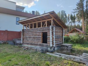 сруб из зимнего леса,сосна. Рубленый в чашу. Крыша односкатная ,кровля андулин.