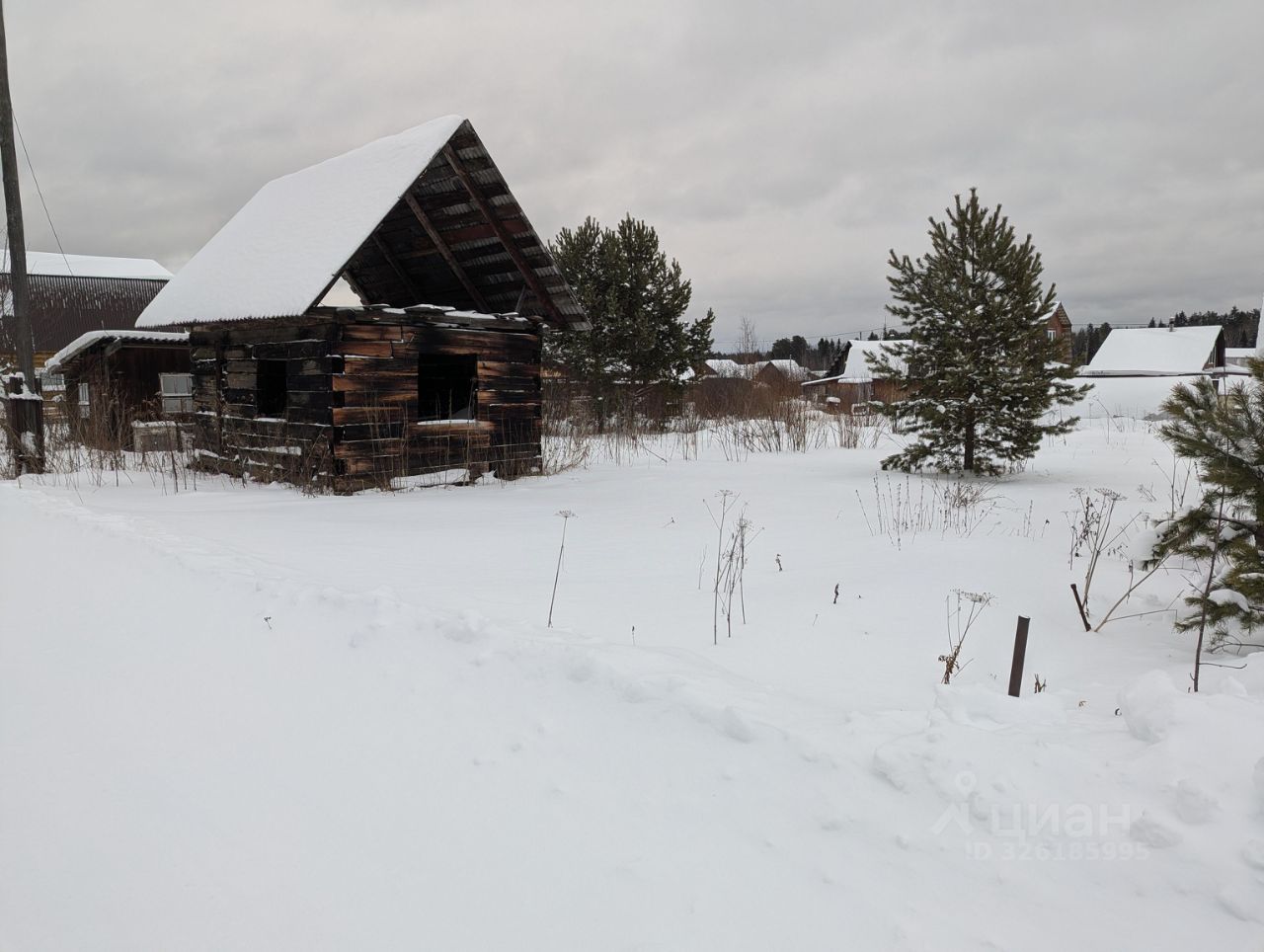 На участке расположен сарай под инвентарь (в нём есть электричество) и сруб из железнодорожных шпал.