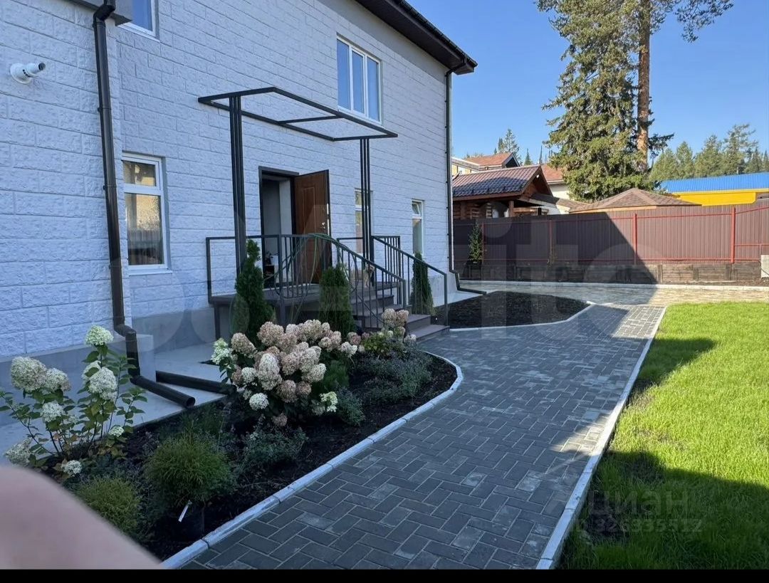 Участок ухоженный с дорожками и цветочными клумбами, деревьями и кустарниками.