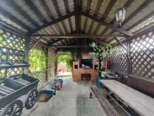 Огромная беседка с качелями, мангальной зоной и столом. Комфортно собираться большими компаниями.