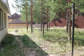 Природа: участок на возвышенности, с соснами; за забором — лесной массив.